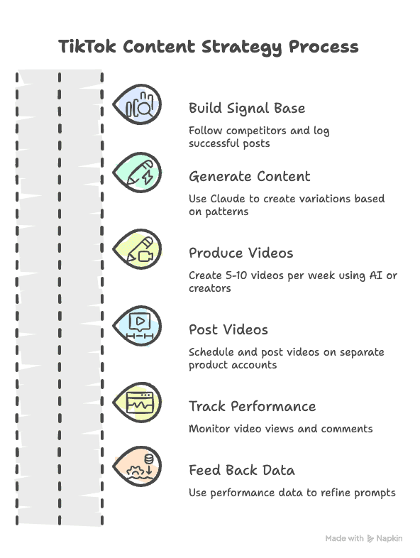 Step 4: Post, track, feed back Run a fresh TikTok account per product, not one account for everything Schedule with Buffer or Later Track what crosses 5k views Feed those winners back into your prompts The loop gets smarter every cycle. Research → generate → produce → post → iterate.